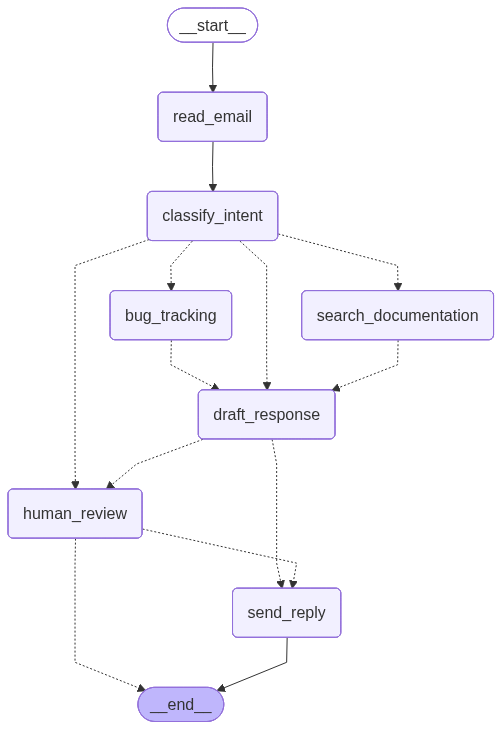 workflow.add_conditional_edges("classify", ["search_docs", "bug_tracker"])